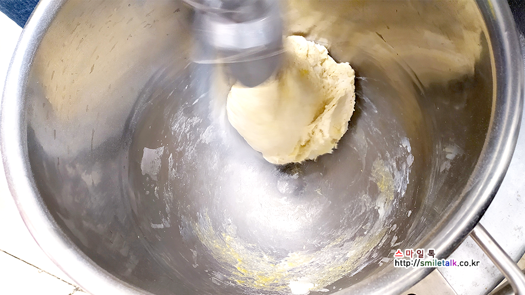 계란과, 물을 넣고 반죽이 한덩어리가 될때까지 1단으로 섞어준다.