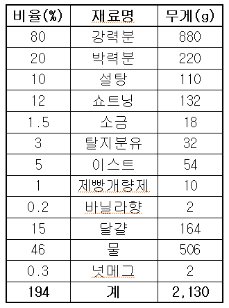 시험 배합표에는 강력분에 박력분이 포함되어 있다.
