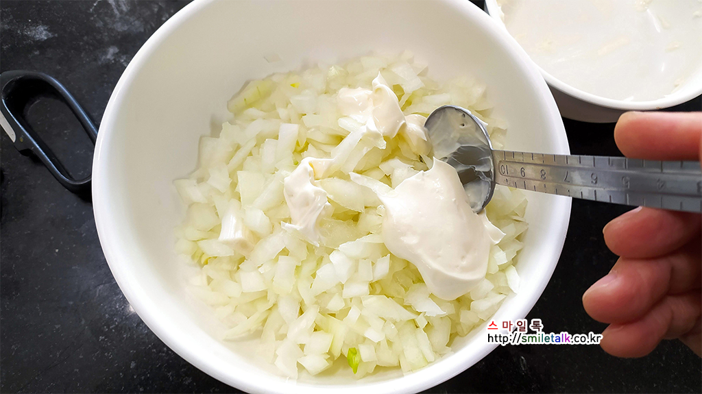 양파에 마요네즈를 전부 섞어서 토핑으로 사용해도 되고,