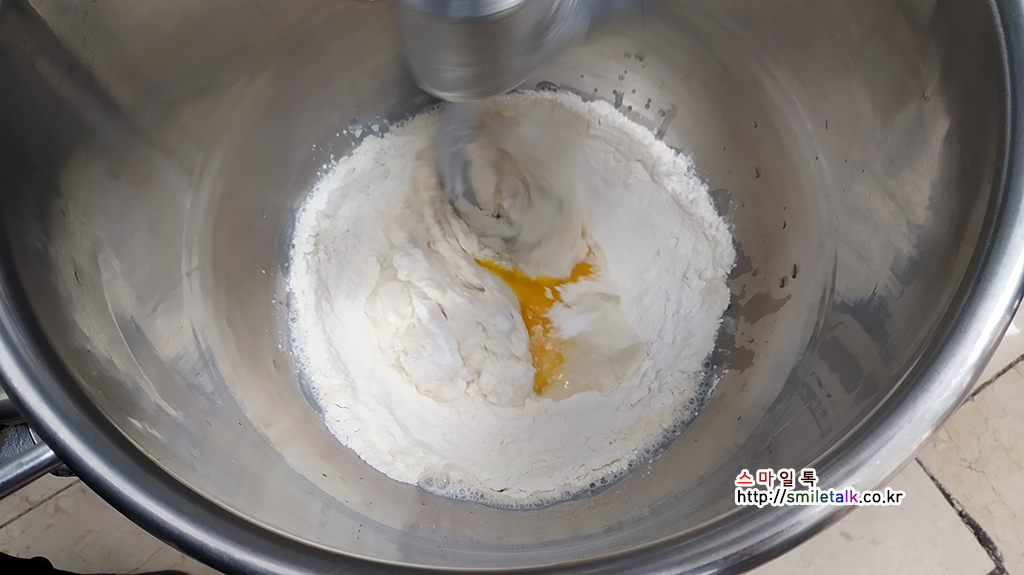 계란, 물을 넣고 반죽이 한덩어리가 될때까지 1단으로 섞어준다.