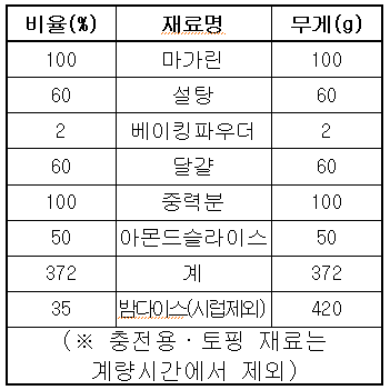 | ※ 밤식빵을 제조하여 제출하시오. 1) 반죽 재료를 계량하여 재료별로 진열하시오(10분). ![]() 2) 반죽은 스트레이트법으로 제조하시오. 3) 반죽온도는 27℃를 표준으로 하시오. 4) 분할무게는 450g으로 하고, 성형시 450g의 반죽에 80g의 통조림 밤을 넣고 정형하시오(한덩이:one loaf). 5) 토핑물을 제조하여 굽기 전에 토핑하고 아몬드를 뿌리시오. 6) 반죽은 전량을 사용하여 성형하시오. |