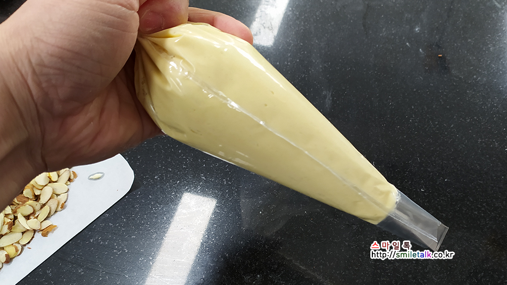 짤주머니 앞에 납짝한 모양깍지를 넣고,