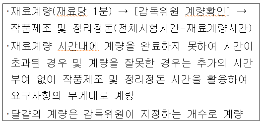 | ※ 풀만식빵을 제조하여 제출하시오. 1) 배합표의 각 재료를 계량하여 재료별로 진열하시오(9분). ![]() 2) 반죽은 스트레이트법으로 제조하시오. (단, 유지는 클린업 단계에 첨가하시오.) 3) 반죽 온도는 27℃를 표준으로 하시오. 4) 표준분할무게는 250g으로 하고, 제시된 팬의 용량을 감안하여 결정하시오. (단, 분할무게×2를 1개의 식빵으로 함) 5) 반죽은 전량을 사용하여 성형하시오. |