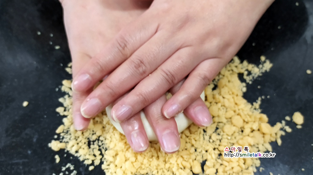 올린후 양손을 포개어 눌러서 소보로를 뭍혀준다.