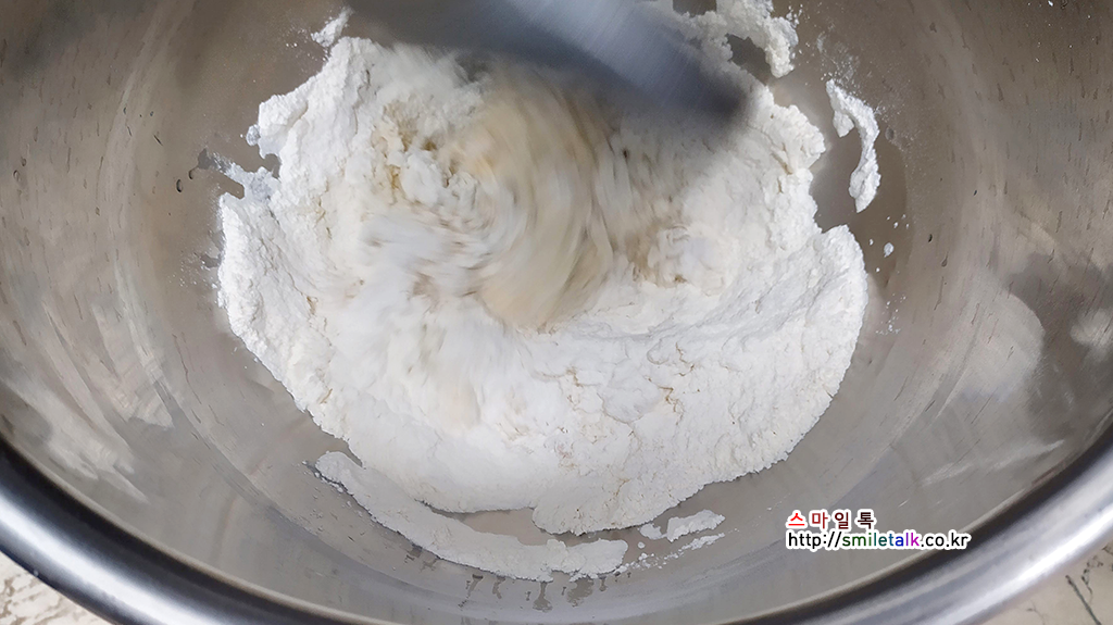 가루재료를 먼저 넣고 1단으로 섞어주다가,