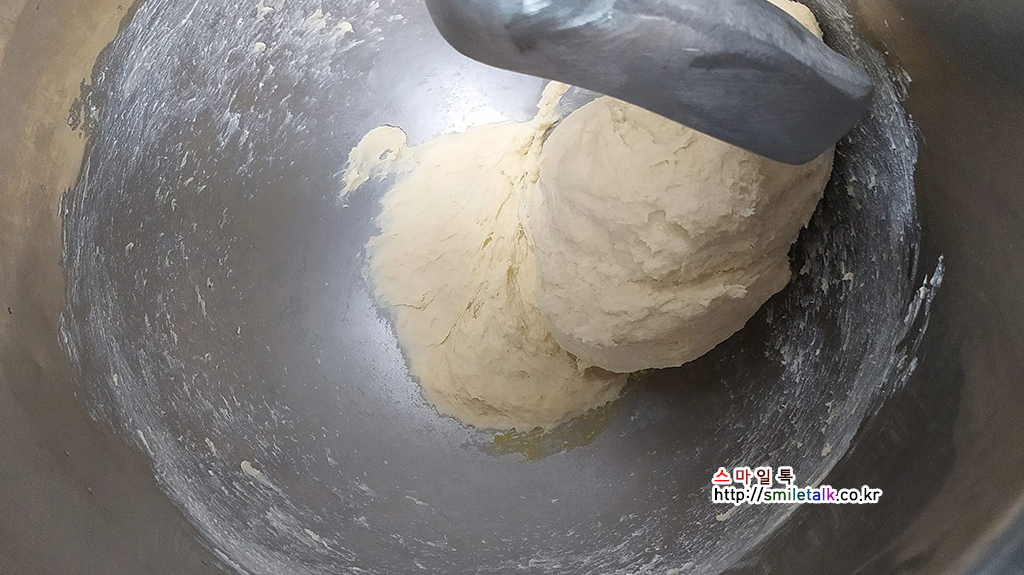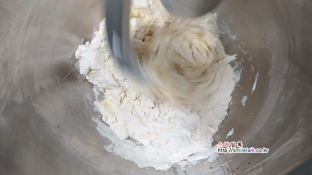 계란, 물을 넣고 반죽이 한덩어리가 될때까지 1단으로 섞어준다.