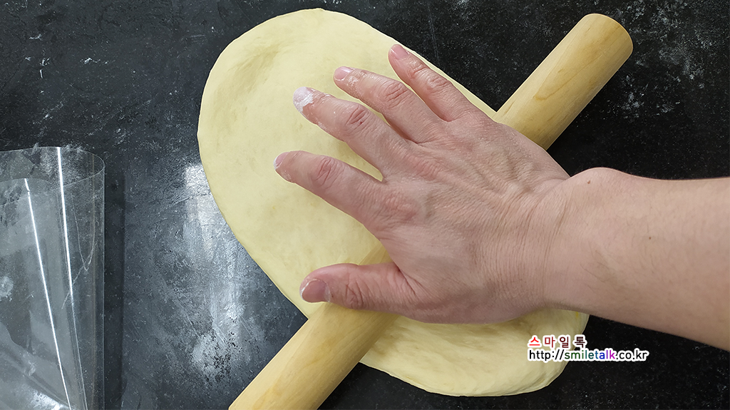 반죽을 밀대를 이용해서 밀어 펴준다.
