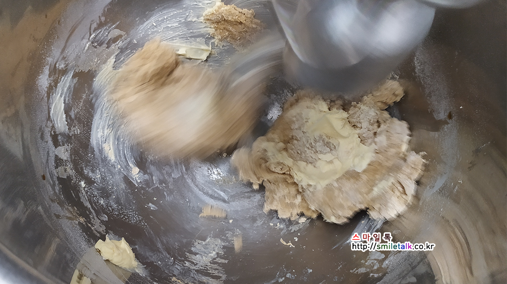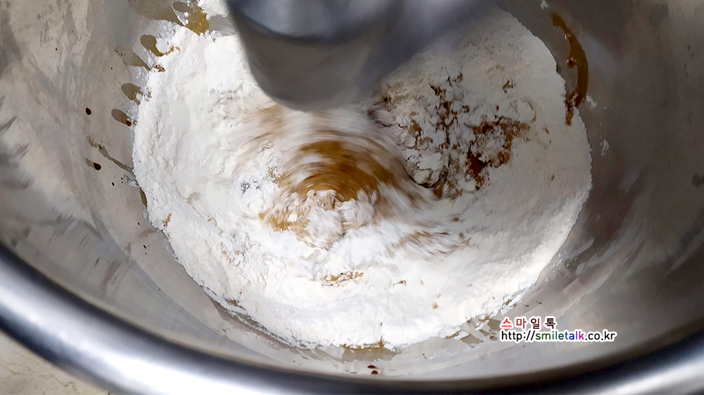 가루재료를 먼저 넣고 1단으로 섞어주다가,