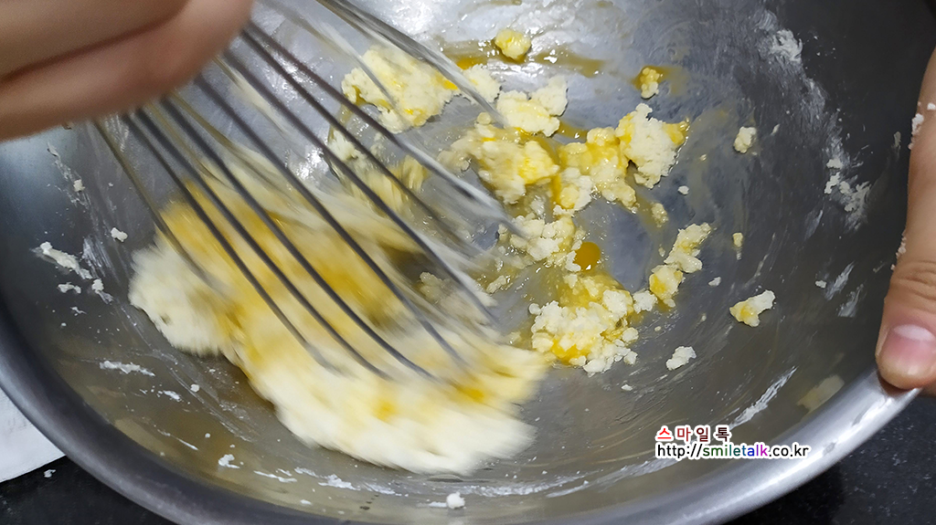 계란을 나눠서 넣어가면서 휘핑해준다.