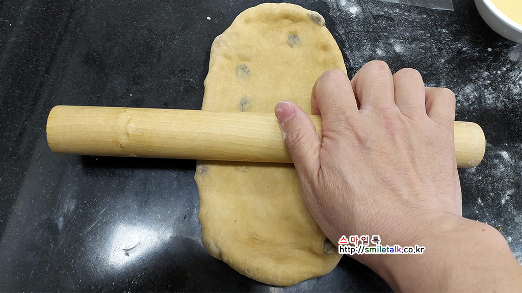반죽을 밀대로 밀어서 타원형(럭비공 모양)으로 성형을 한다.