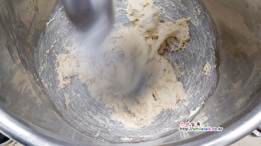 계란, 물을 넣고 반죽이 한덩어리가 될때까지 1단으로 섞어준다.