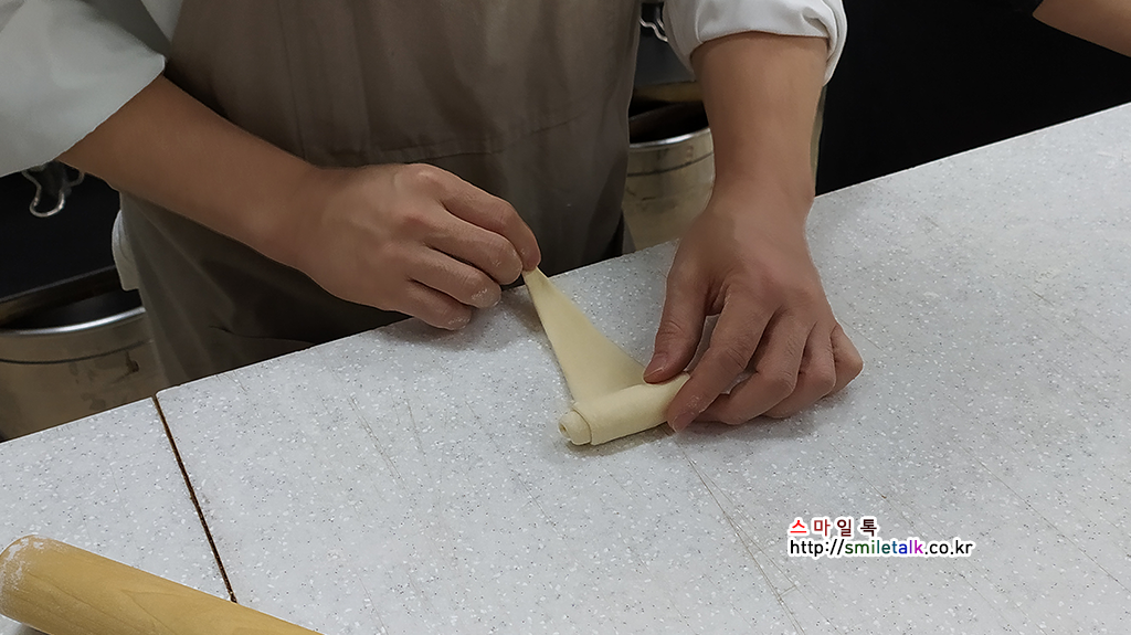 밀대로 밀어서 삼각형 모양으로 밀어 펴주면서,