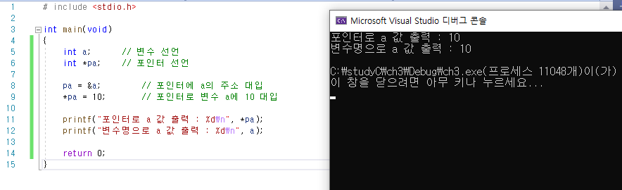 printf("포인터로 a 값 출력 : %d\n", *pa);