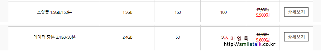 각가 5,500원, 5,800원이며, 첫번재 요금제는 데이터 1.5G, 통화 150분, 문자 100건이며,
