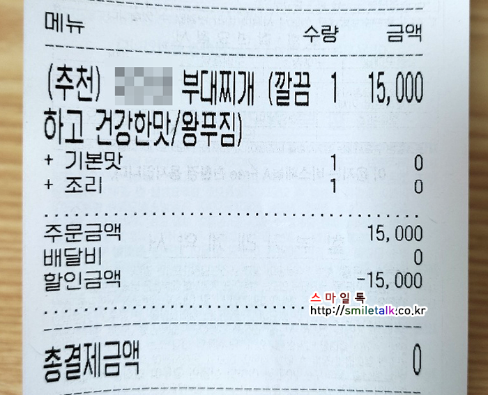 부대찌게 시켜봤는데, 배달비 무료인 15,000원 짜리 메뉴여서,