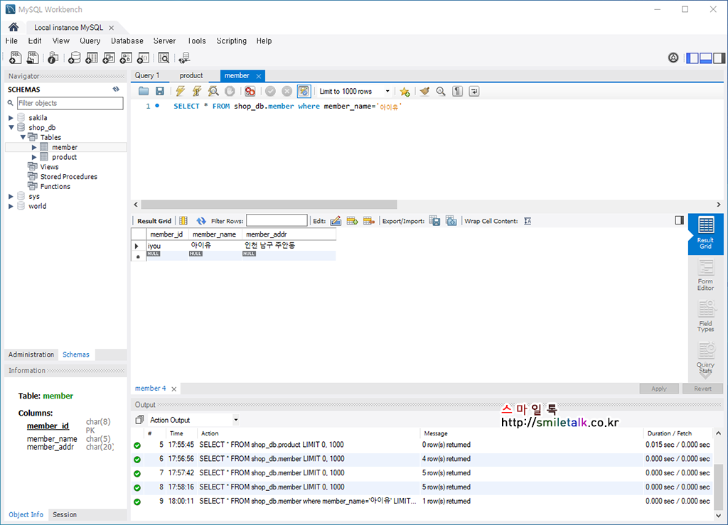 기본미션 : p.80 - shop_db의 회원 테이블(member)에서 아이유 회원에 대한 정보만 추출한후 결과화면 인증샷