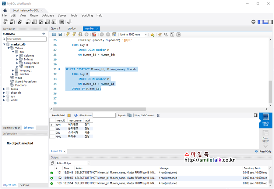SELECT DISTINCT M.mem_id, B.prod_name, M.mem_name, M.addr