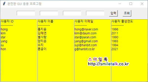 입력 버튼을 눌러서 추가를 한후, 조회 버튼을 눌러 결과 값을 출력한 화면 입니다.