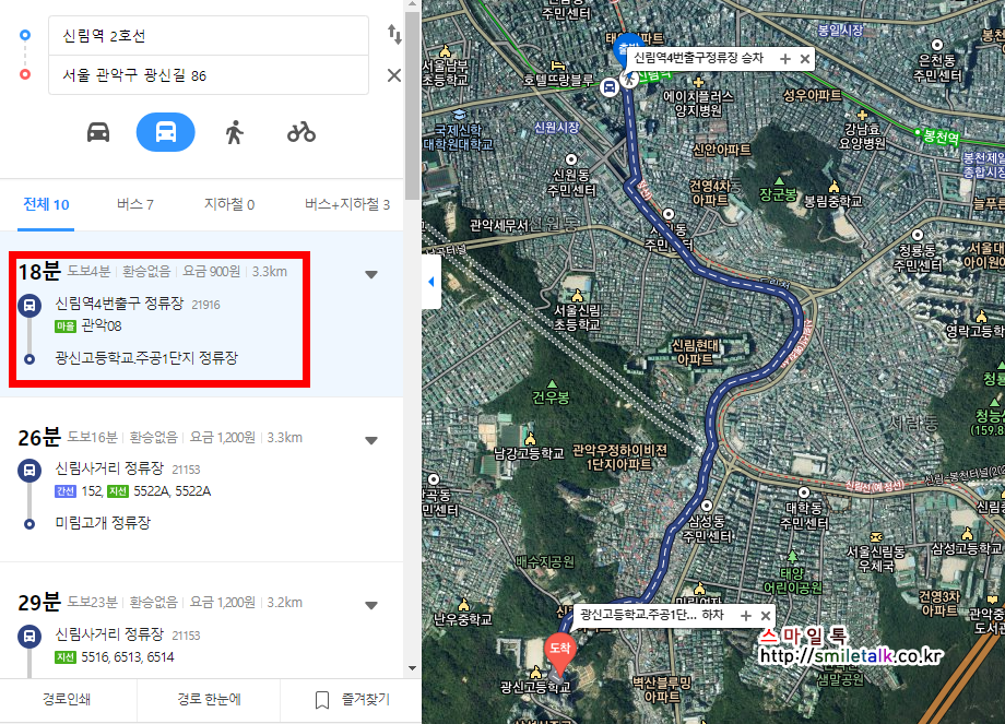 신림역에서 마을버스 관악08번 버스를 이용하면 18분 정도 소요가 되기 때문에,