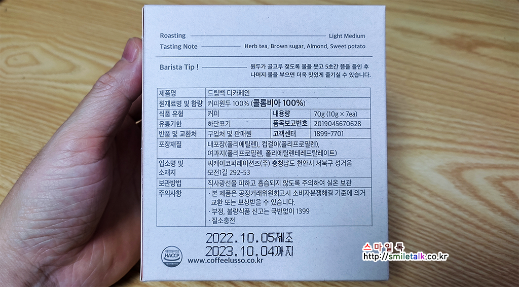 루소 드립백 디카페인 제품은 드랩팩당 10g 씩,