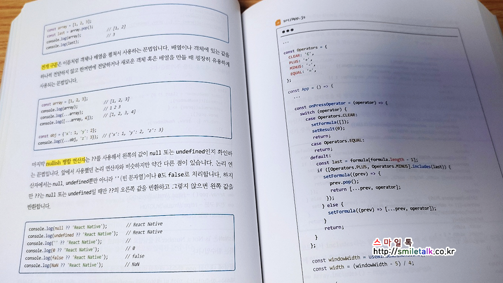 리액트에 대해서 전혀 모르는 나 같은 사람도 어렵지 않게 시작을 할수 있도록 책의 앞부분에서는 필요한 개발도구와 안드로이폰과 iOS폰에 필요한 앱들을 설치하는 방법등 자세히 저자분이 알려주고 있어서 전혀 몰라도 그대로 따라서 설치하고 하다 보면, 챕터 2부터 시작하는 계산기 만들기 프로그래밍을 따라하는데 큰 어려움은 없을 것이다.